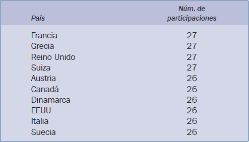 Los 10 países con la participación más alta en los juegos olímpicos se presentan en la tabla 4.