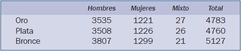 A lo largo de las 27 ediciones de los juegos olímpicos modernos, en la categoría masculina se entregaron en total 3335 medallas de oro, 3508 de plata y 3807 de bronce; en categoría femenina se concedieron 1221 medallas de oro, 1226 de plata y 1299 de bronce, mientras que en categoría mixta se dieron 27 medallas de oro, 26 de plata y 21 de bronce (tabla 7).