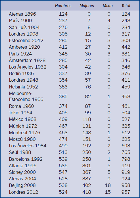 Latabla 8 presenta datos acerca de la participación de los deportistas masculinos y femeninos en los diferentes juegos olímpicos. Se observa que en la primera edición, la de Atenas 1896, no se permitieron las competiciones femeninas y que, en general, la participación de las mujeres fue escasa hasta los Juegos de Ámsterdam, en 1928. A pesar del aumento considerable de las deportistas en las competiciones olímpicas, el número total de las medallistas nunca ha alcanzado la cantidad de los deportistas masculinos en los podios.