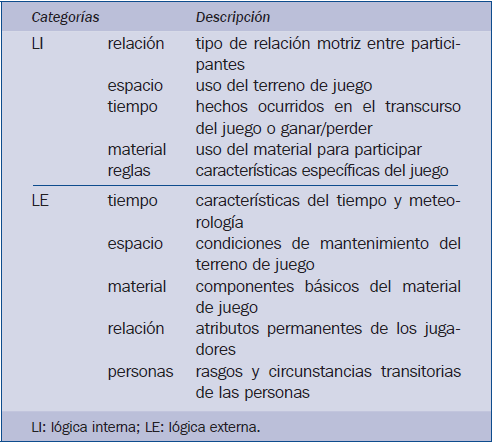 La lógica interna (LI) del juego motor exige al jugador una participación inteligente en las relaciones que debe mantener con el resto de jugadores, espacio, tiempo y material (Alonso, López de Sosoaga, & Segado, 2011; Parlebas, 2012).