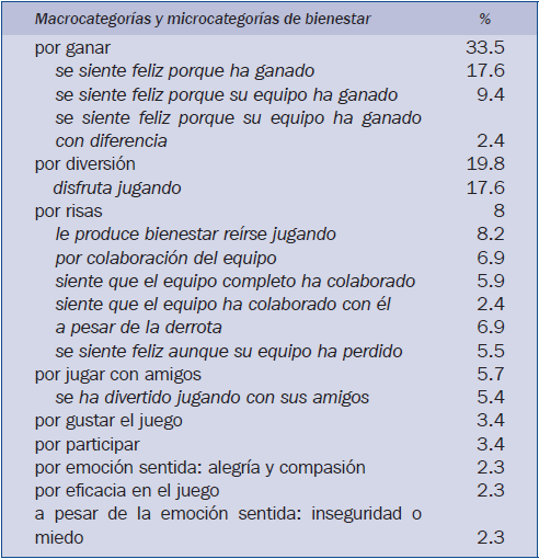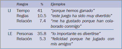Se encontraron comentarios en los que aparecían mencionados simultáneamente varios rasgos de la LI, como “porque el equipo ha funcionado muy bien y hemos ganado” o de la LE como “estoy feliz porque he jugado con mis amigos”, y algunas narraciones combinaban rasgos de la LI y de la LE, como “estoy contento porque he ganado y me he divertido con este juego”.