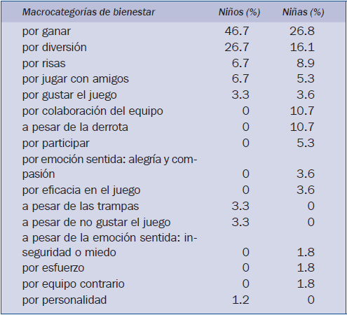 Del mismo modo, los comentarios fueron analizados desde la perspectiva de género (tabla 5), con la finalidad de averiguar si existían o no diferencias entre niños y niñas cuando justifican su vivencia emocional positiva experimentada durante un juego de cooperación-oposición con competición.