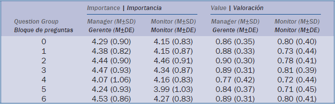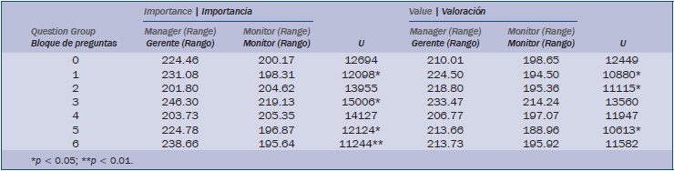 La tabla 2muestra que los gerentes consiguen un mayor rango promedio de puntuaciones en los bloques de preguntas 1, 3, 5 y 6 en la variable importancia así como mayor rango en los bloques 1, 2 y 5 de la variable valoración. Cuando se compara gerentes vs monitores, independientemente del bloque de preguntas, los gerentes (1896.56) consiguen mayor rango promedio que los monitores (1718.61) en importancia (U = 947668; p < 0.001) así como en valoración (U = 574775; p < 0.001; gerentes: 1517.70 y monitores: 1381.73).