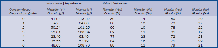 La prueba Kruskal-Wallis permitió determinar que existen diferencias en la variable importancia en función del grupo de preguntas, tanto para el grupo de gerentes (χ2 = 20.71; p < 0.01) como de monitores (χ2 = 73.64; p < 0.001). Respecto a la variable valoración, existen diferencias sólo para el grupo de monitores (χ2 = 18.84; p < 0.01). Concretamente, la comparación de pares a través de la prueba U Mann-Whitney mostró múltiples diferencias en el número de casos observados entre 1-5 o en la proporción observada de casos de 0 y 1 respecto a la referencia para ambos grupos.