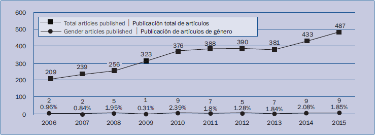 Además, se observa un incremento, tanto en la producción científica de las revistas seleccionadas a lo largo de los años estudiados, como en la producción de artículos relacionados con el género, siendo este incremento más visible a partir del año 2010 (figura 1). Así, desde este año, se aprecia un aumento en la producción de estudios de género, siente el periodo de 2006 a 2009 el menos productivo en este sentido. Concretamente, el porcentaje más bajo se produce en el 2009, con un solo artículo publicado y un porcentaje sobre el total de la producción de un 0.31%, mientras que 2010 y 2014 son los años más productivos con la publicación de 9 artículos cada año y con porcentajes relativos que superan el 2%.