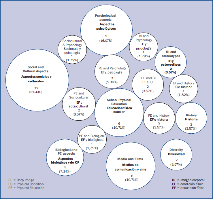 Los 56 artículos se pueden agrupar en torno a 8 áreas temáticas: a) Aspectos sociales y culturales; b) Aspectos psicológicos; c) Educación física escolar; d) Imagen corporal y estereotipos de género; e) Historia; f) Aspectos biológicos y de condición física; g) Medios de comunicación y cine, y h) Diversidad. Algunos de los artículos hacen referencia a dos áreas temáticas. En la figura 2se representan el número y porcentaje de artículos relacionados con los estudios de género según las mencionadas áreas. Como se puede observar, un conjunto de 39 artículos (el 69.64%) de los estudios de género publicados en las revistas españolas, trata de aspectos sociales y culturales (con un total de 15 artículos, el 26.79% sobre el total de artículos de género), psicológicos (con 14, el 25.00%) y, especialmente, de educación física escolar (con 16, el 28.57%) que, además, es el área con mayor conexión con el resto de áreas temáticas.