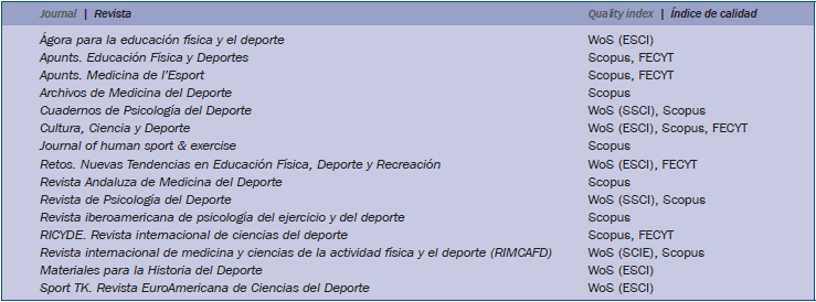 Finalmente, el cuerpo de la investigación estuvo conformado por los artículos publicados en quince revistas españolas del ámbito de las CAFDE, con el índice de calidad que se señala en la tabla 1.