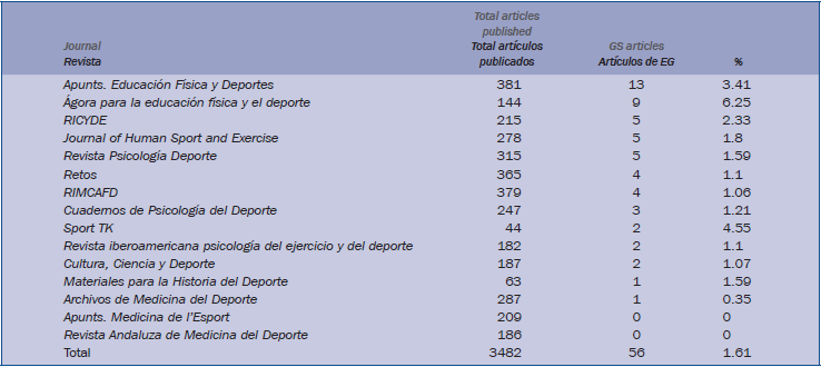 De los 3482 artículos publicados en la última década en revistas especializadas españolas de CAFDE, solo 56 tratan sobre contenidos de este campo de estudios, lo que corresponde a un 1.61%. De las 15 revistas seleccionadas, las dos que más artículos han publicado en sus páginas son Apunts. Educación Física y Deportes . Ágora para la educación física y el deporte (tabla 2).