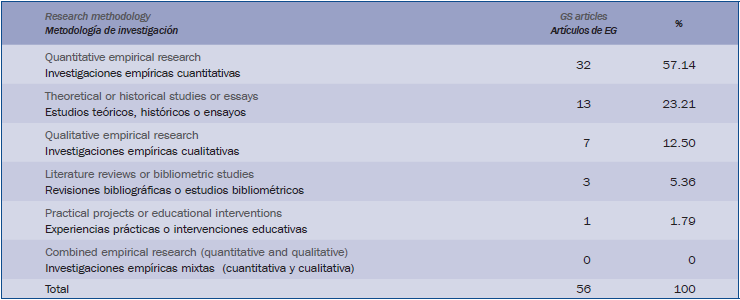 Más de la mitad de los artículos de género publicados en las revistas analizadas son estudios empíricos de tipo cuantitativo. Casi una cuarta parte son estudios teóricos, históricos o ensayos y, poco más de una décima parte, corresponde a estudios empíricos de tipo cualitativo. Estos tres tipos de artículos son los predominantes, llegando conjuntamente a un 92.85% del total de los estudios de género. Los artículos de revisión bibliográfica y los referidos a experiencias prácticas o intervenciones son puntuales, no encontrándose ningún artículo de investigación empírica que utilice una metodología mixta (cuantitativa y cualitativa) (tabla 3).