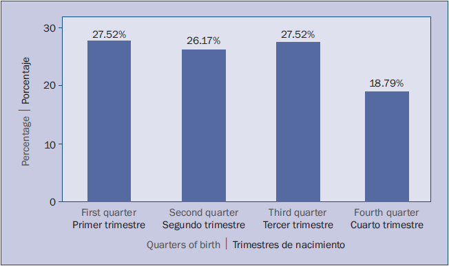 Se calcularon los estadísticos descriptivos y frecuencias mediante el software SPSS 22.0. El análisis de las diferencias de distribución de porcentajes en cada trimestre y año (impar o par) de nacimiento, según sexo y puesto específico, se calculó con la prueba de chi-cuadrado (χ2), comparándose las proporciones de las columnas mediante pruebas Z y utilizando el método de Bonferroni para la corrección de los valores “p” de las pruebas.