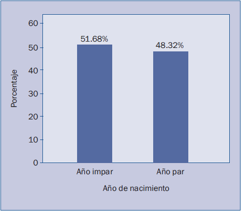 En la figura 2se pueden comprobar las proporciones de los jugadores que componen los distintos equipos en función del año de nacimiento, impar o par. Aunque la proporción es mayor entre los de años impares, no existen diferencias estadísticamente significativas (χ2(1) = 0.168; p = 0.682).