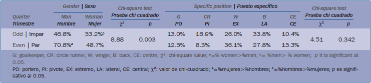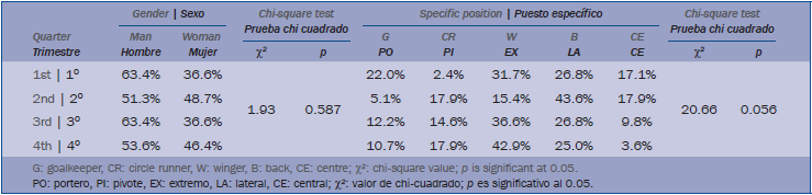 Los resultados del test chi-cuadrado mostraron que no existen diferencias significativas entre hombres y mujeres según el trimestre de nacimiento para formar parte de los equipos. Tampoco se hallaron diferencias estadísticamente significativas en función del puesto específico de juego; no obstante, conviene reseñar algunos porcentajes. La proporción más alta entre los del primer trimestre corresponde a los extremos, seguidos de los laterales, mientras que apenas si hay pivotes. Entre los nacidos en el segundo trimestre, los porcentajes de laterales doblan ampliamente al resto de puestos específicos. También se puede decir que los porteros son nacidos principalmente en el primer trimestre, al revés que los pivotes, que apenas si presentan nacidos en los primeros meses del año. Entre los extremos, predominan los de los últimos meses del año, y entre los laterales, los nacidos en el segundo trimestre. Finalmente, los centrales son nacidos, sobre todo, en los primeros seis meses del año. (Tabla 1)
