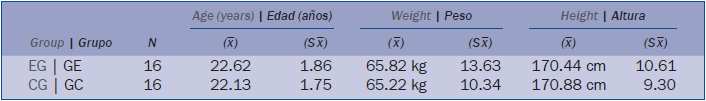 La muestra estuvo constituida por 32 personas de ambos sexos (16 mujeres y 16 hombres), siendo practicantes regulares de actividad fisicodeportiva de tipo recreativo. Fueron divididos en dos grupos aleatorios pero conservando una proporción similar de individuos de ambos sexos (ocho mujeres y ocho hombres por grupo). El grupo experimental (GE) se sometería a un programa de entrenamiento HIIT y el grupo control (GC) a un programa de entrenamiento basado en la carrera continua. El criterio de inclusión era no tener experiencia previa en el tipo de entrenamiento HIIT. La tabla 1muestra las caractarísticas de las personas participantes.