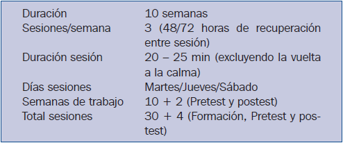 La estructura de las sesiones fue siempre similar utilizando la misma densidad de trabajo y los mismos ejercicios, siempre supervisadas por un graduado en CAFDE: