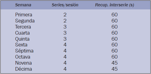 Parte principal: series de cuatro min compuestas por ocho ejercicios ejecutados durante 20 s a la máxima intensidad/velocidad y con una recuperación entre ellos de 10 s. Durante el programa, el número total de series por sesión progresó de dos a cuatro, siempre realizando un minuto de descanso entre ellas (tabla 3).