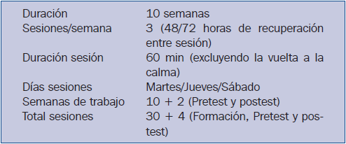 La duración total del estudio fue de 12 semanas. La primera se dedicó a la formación previa de los participantes en sus respectivos protocolos de entrenamiento (dos sesiones de formación inicial en los diferentes ejercicios y su desarrollo) y en la realización del pretest, mientras que la última semana se dedicó a la realización del postest.