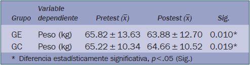 Los resultados de la tabla 5muestran que tanto el GE como el GC logran una reducción significativa de la variable “peso” después de las 10 semanas de entrenamiento. Los sujetos del GE expuestos al protocolo de entrenamiento HIIT han reducido significativamente su peso corporal, con una media de 1.94 kg, siendo la reducción de peso del GC con entrenamiento basado en la carrera continua de 0.56 kg.