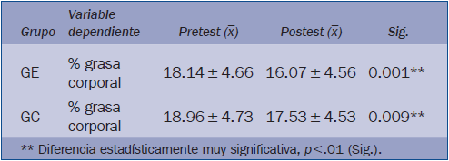 Con respecto al % de tejido graso corporal estimado, se comprueba una reducción muy significativa en las mediciones del postest en los individuos de ambos grupos (tabla 6). Se observa una reducción del GE de 2.07% frente al 1.43% del GC, lo que indica que la reducción de peso no se ha hecho a expensas de la materia magra de los individuos.