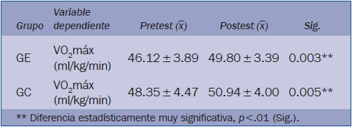 Las mediciones del VO.máx estimado también han mostrado aumentos muy significativos en el GE y el GC tras el período de entrenamiento (tabla 7), siendo el aumento medio de 3.68 ml/kg/min en los sujetos del GE y de 2.59 ml/kg/min en el GC.