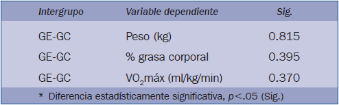 En último lugar, la comparación de los resultados intergrupo de las tres variables han mostrado la inexistencia de diferencias significativas entre los valores del postest de GE y GC (tabla 8).