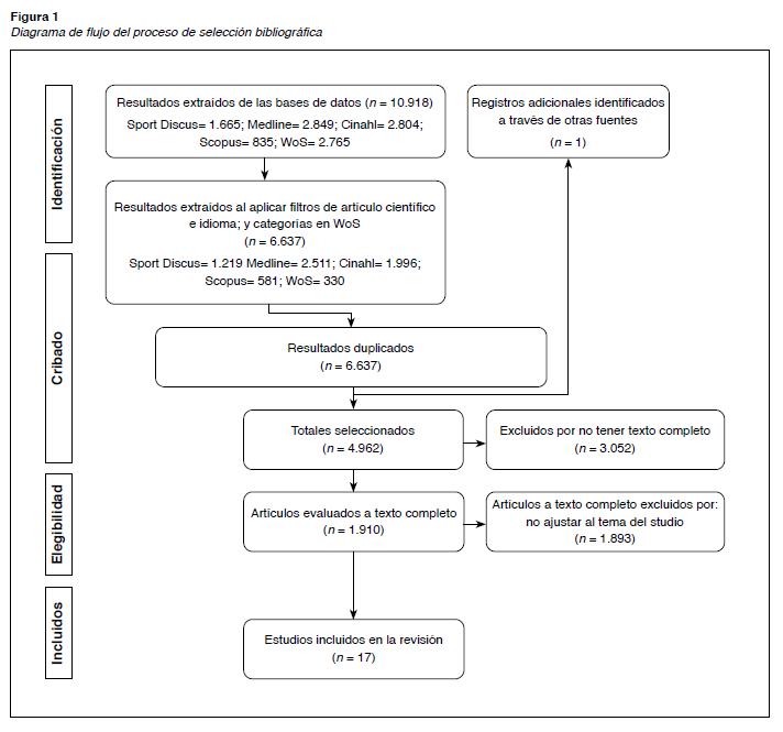 Al total de los artículos encontrados se les aplicaron criterios de selección. Se incluyeron artículos científicos publicados en castellano, inglés y francés, que se aplicaron como filtros de búsqueda. Se excluyeron aquellos de los que no se obtuviera texto completo, no se ajustasen al tema de estudio, o fuesen casos, series de casos y revisiones. No se estableció un límite temporal. Además, en WoS se limitaron los resultados a tres categorías Al total de los artículos encontrados se les aplicaron criterios de selección. Se incluyeron artículos científicos publicados en castellano, inglés y francés, que se aplicaron como filtros de búsqueda. Se excluyeron aquellos de los que no se obtuviera texto completo, no se ajustasen al tema de estudio, o fuesen casos, series de casos y revisiones. No se estableció un límite temporal. Además, en WoS se limitaron los resultados a tres categorías para ser más preciso en los resultados (Sports Sciences, orthopedics, rehabilitation). ( Figura 1).
