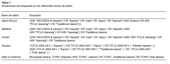 El proceso de obtención de la información que se recoge en este estudio se realizó mediante una revisión sistematizada en las bases de datos Sport Discus, Medline, Cinahl Scopus y Web of Science (WoS). La búsqueda se llevó a cabo en el utilizando los siguientes descriptores del Medical Subjects Headings (MeSH): «WOUNDS & injuries», «FOLK dancing» y “dancing” «Traditional dance». Para completar la búsqueda, se incluyeron las palabras clave: «injuries», “athletic injuries”, «pain», «injury», «injured», “dance” y “traditional dance” (Tabla1).