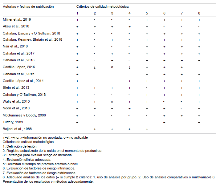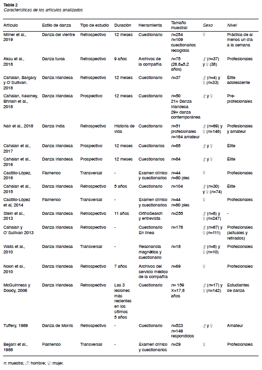 El análisis de los resultados permite establecer ciertas similitudes y diferencias entre los diferentes estilos de danza tradicionales de todo el mundo. Uno de los principales problemas de los trabajos realizados hasta la fecha es que la gran mayoría son de tipo retrospectivo (Aksu et al., 2018;Cahalan, Bargary & O`Sullivan 2018; Cahalan et al., 2015; Cahalan & O´Sullivan 2013; McGuinness & Doody 2006; Milner et al., 2019; Nair et al., 2018; Noon et al., 2010; Stein et al., 2013; Tuffery 1989), con los inconvenientes de pérdida de información que esto conlleva. Y tan solo 3 de los 17 resultados fueron de carácter prospectivo (Cahalan et al., 2016; Cahalan et al., 2017; Cahalan, Kearney, Bhriain et al., 2018). Todos los artículos presentaron muestras de ambos sexos excepto los de Milner et al. (2019) realizado en danza del vientre, los de Beijani et al. (1988), Castillo-López y Vargas-Macías (2014) y Castillo-López (2016) en flamenco y el de Noon et al. (2010) en danza irlandesa, que únicamente analizaron los resultados en mujeres. Por otro lado, los bailarines fueron en su mayoría de alto nivel, refiriéndose a ellos como profesionales, preprofesionales, élite o estudiantes de danza a tiempo completo. Tan solo el estudio de Tuffery (1989) en danza de Morris, el de Milner et al. (2019) en danza del vientre y el de Nair et al. (2018) en danza india incluyeron bailarines amateurs.