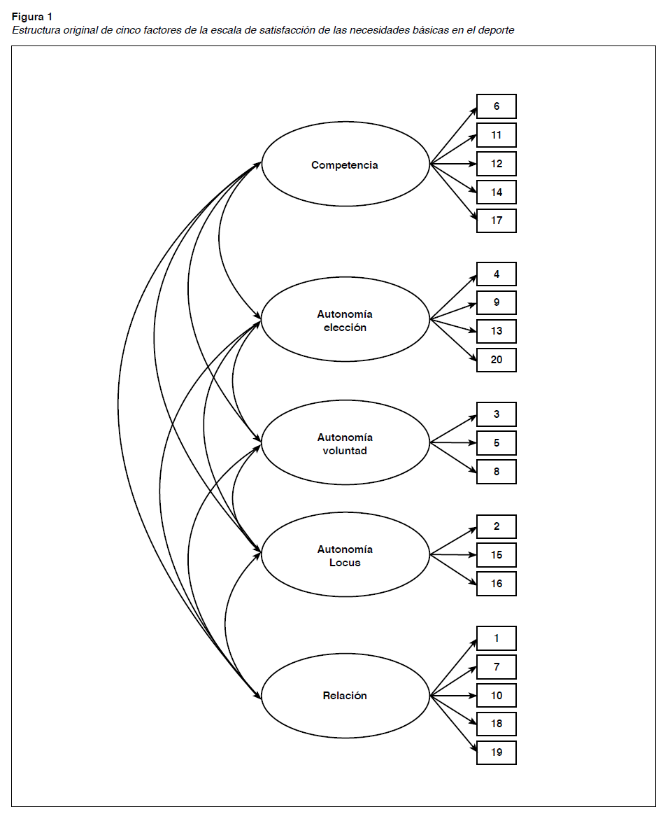 Dado que estas últimas escalas estaban centradas en la práctica de actividad física para la salud, emergió la necesidad del desarrollo de herramientas relacionadas con la evaluación de necesidades psicológicas en contextos de rendimiento deportivo o de consecución de logros. Para cubrir esta área, Ng et al. (2011) desarrollaron un instrumento específico para deporte competitivo: la BNSSS, que estaba compuesta por 20 ítems: cinco ítems por competencia; 10 dedicados a la dimensión de autonomía de los cuales, tomando como referencia el estudio de Reeve et al. (2003), se dividían en cuatro ítems para la capacidad de elección, tres para la subescala de voluntad y tres ítems para locus percibido de causalidad interno (IPLOC); y, por último, cinco ítems para la necesidad de relación. La escala presentó los siguientes valores α de Cronbach para cada subescala: ,77 para competencia; ,82 para autonomía elección; ,61 en autonomía voluntad; ,76 para autonomía IPLOC, y ,87 para relación. Además, indicó unos valores de χ2 = 341,70 (p < ,01), NNFI =,96, CFI =,97, media residual estandarizada =0,07 y media cuadrática de los errores de aproximación =,06, (0,4-0,7 del intervalo de confianza de la media cuadrática de los errores de aproximación 90 %). Por todo ello se considera que posee, en general, buenas propiedades psicométricas de validez factorial y fiabilidad.