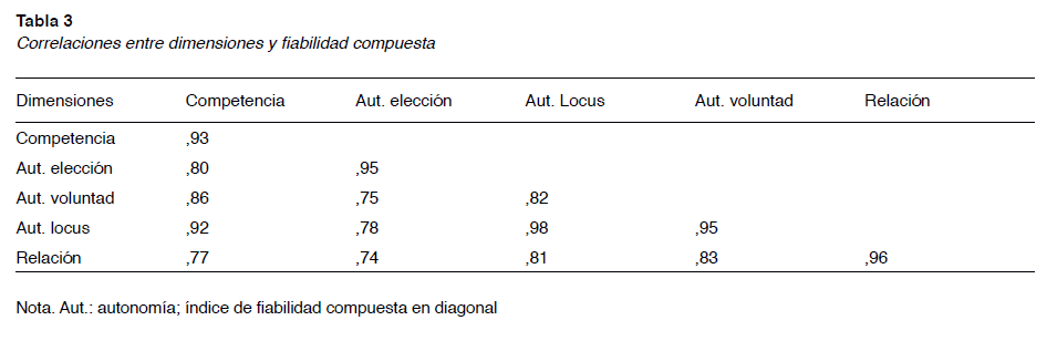 En la Tabla 3, además de las correlaciones entre factores, se muestran los resultados obtenidos al respecto de la fiabilidad compuesta. Para este modelo, el mayor índice de fiabilidad se encontró para la dimensión relación (,96) y el índice más bajo en autonomía voluntad (,82), siendo este último superior al límite de ,70.