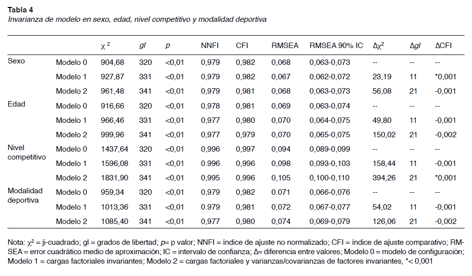 En la Tabla 4 se observan los índices obtenidos sobre la invarianza para sexo, edad, nivel competitivo y tipo de deporte.