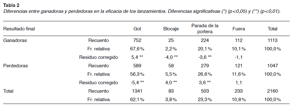 En la eficacia de los lanzamientos aparecieron diferencias significativas entre los equipos ganadores y perdedores (. < 0,01). Los equipos ganadores obtuvieron un mayor número de goles y menores valores de finalización de sus lanzamientos en paradas de las porteras y blocajes (. < 0,01) (Tabla 2).