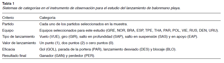 La muestra estuvo compuesta por 2160 lanzamientos correspondientes a 38 partidos del Mundial Sénior Femenino de Balonmano Playa de Kazán 2018 (Hernández et al., 2014). Se analizaron todos los lanzamientos efectuados en los encuentros donde se enfrentaron directamente equipos clasificados en la Main Round: Brasil, China Taipéi, Dinamarca, España, Grecia, Noruega, Paraguay, Polonia, Rusia, Tailandia, Uruguay y Vietnam.