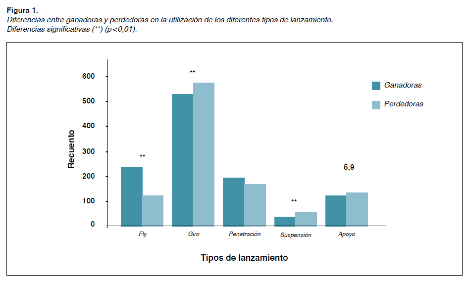 Se destacaron los lanzamientos espectaculares sobre los simples. El giro fue claramente el tipo de lanzamiento prioritario tanto en ganadoras como perdedoras y puede considerarse como el recurso principal ofensivo utilizado en los ataques posicionales (Morillo et al., 2015; Lara et al., 2018; Lara y Sánchez, 2018).