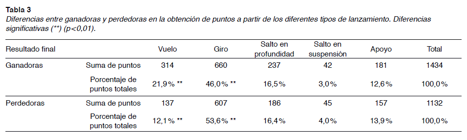 El 91,3 % de los goles obtenidos fueron lanzamientos con valor doble, distribuidos de la siguiente manera: lanzamientos con giro 45,8 %, en vuelo 16,3 %, de la especialista 17,9 %, de la portera 1,8 % y penaltis 9,5 %. Respecto a la puntuación obtenida por los equipos, también se observó una asociación significativa entre las variables resultado final y puntos obtenidos (. < 0,01). Las diferencias más importantes aparecieron en el peso que tuvieron los puntos obtenidos a partir de los lanzamientos en giro por las perdedoras y mediante los lanzamientos en fly de las ganadoras (. < 0,01) (Tabla 3). **
