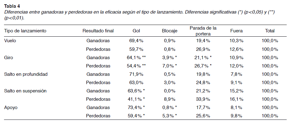 A pesar de la mayor utilización del lanzamiento en giro y de su elevado peso en el total de puntos obtenidos por los equipos perdedores, la eficacia de estos lanzamientos fue significativamente menor en relación con los equipos ganadores (. < 0,01) (Tabla 4). También aparecieron diferencias significativas en los lanzamientos en suspensión y en apoyo (. < 0,05) (Tabla 4).
