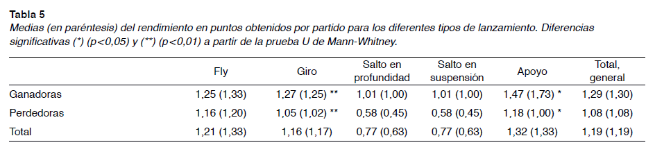 Nuevamente, se encuentran diferencias significativas en el rendimiento de puntos obtenidos a través de los lanzamientos en giro, donde el valor medio obtenido por las perdedoras fue muy bajo, con 1,05 puntos por lanzamiento frente a 1,27 obtenido por las ganadoras. Por otra parte, dentro de los lanzamientos simples las diferencias aparecieron en los lanzamientos en apoyo, donde las ganadoras obtuvieron el mayor rendimiento, fundamentalmente basado en los goles realizados de penalti y de lanzamientos de portería a portería.