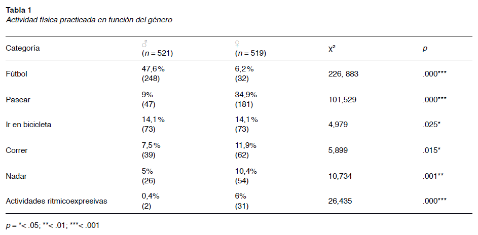 Se verificó la existencia de una asociación entre el género y algunas de las actividades estudiadas. La tabla 1 presenta los resultados relativos a aquellas categorías en las que se han apreciado diferencias significativas entre niñas y niños. En primer lugar, se pudo observar que el fútbol es una actividad practicada fundamentalmente por los niños y muy poco por las niñas (. < .001). No obstante, el porcentaje de niñas que participaban en esta actividad es superior al relativo a las actividades rítmico-expresivas, disciplinas elegidas tradicionalmente por las mujeres (la proporción en baile es del 3,5 %). Se encontraron, asimismo, diferencias estadísticamente significativas al analizar la relación entre el género y actividades como pasear, ir en bicicleta, correr, nadar y las actividades rítmico-expresivas; en todos estos casos se demuestra que son niñas las que más los practicaban.