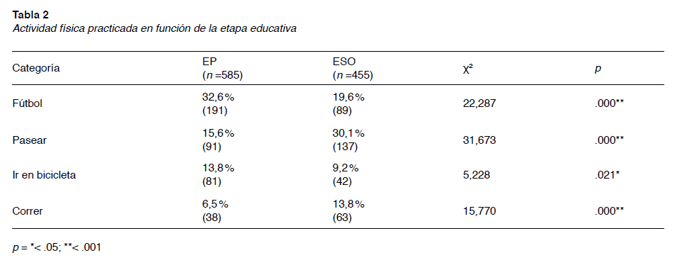 Si tenemos en cuenta la etapa de estudios, se detectaron relaciones estadísticamente significativas en las actividades de fútbol (. < .001) e ir en bicicleta (. = 021) de forma que la proporción de personas que las realizaban pertenecían en mayor medida a primaria. De manera similar, se observaron diferencias en las categorías correr y pasear (. < .001) siendo el alumnado de ESO el que presentó porcentajes mayores de participación. En el resto de las opciones no se apreciaron diferencias significativas (baloncesto . = .074, nadar . = .156, deportes de red . = .836, actividades ritmicoexpresivas .: .607 y en actividades de deslizamiento sobre ruedas . = .748).