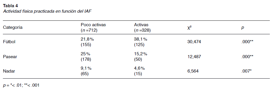 Se detectaron asociaciones entre el IAF y el tipo de actividad informal elegida. Los datos indicaron relaciones entre las personas activas y el fútbol (. < .001) y entre las poco activas y nadar (. < .01) y pasear (. < .001). Respecto al resto de categorías, se asumió que la realización de esas actividades era independiente del nivel de actividad física que se tenía (ir en bicicleta .: .648, baloncesto . = .109, correr . = .847, deportes de red . = .262, actividades rítmico-expresivas . = .179 y en actividades de deslizamiento sobre ruedas . = .113).