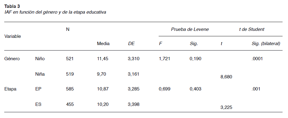 También, el IAF resultó ser mejor en la etapa de EP que en la de ESO, algo señalado en trabajos como el de Aznar et al. (2011) o Martínez-Martínez et al. (2012). En Marques y Carreiro da Costa (2013) el IAF decrece con la edad en el alumnado de Educación Secundaria.