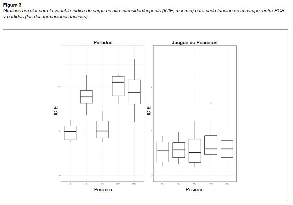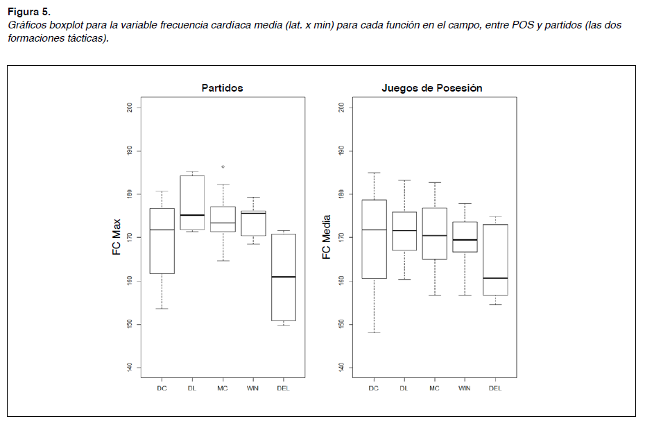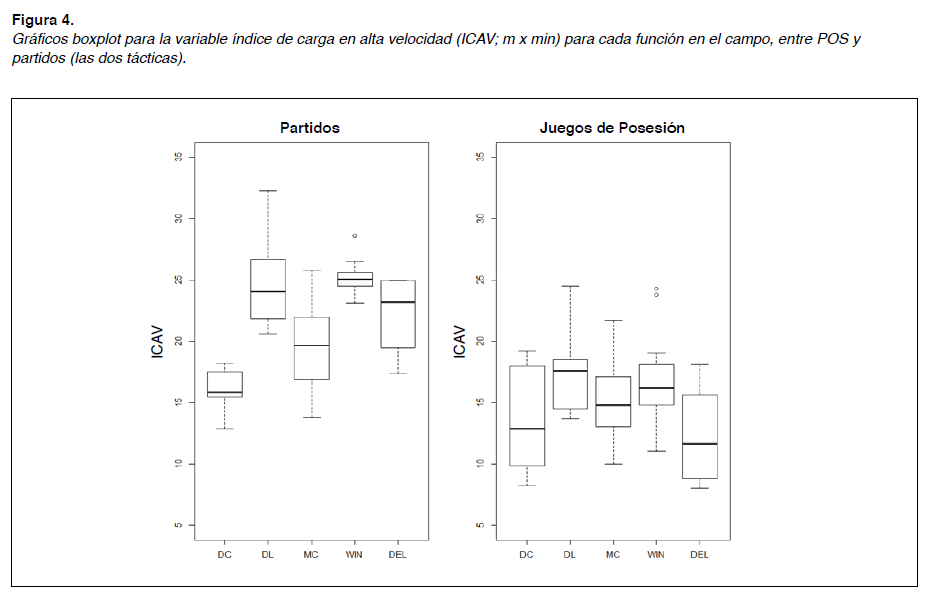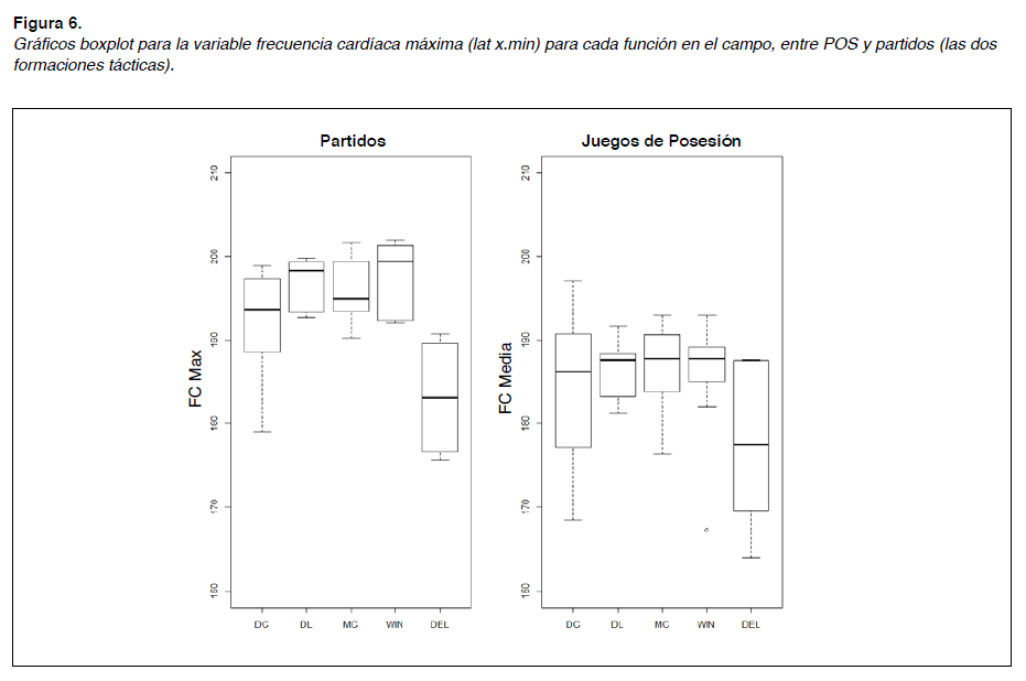 Los gráficos de boxplot para cada variable de estudio están detallados en las figuras 1, 2, 3, 4, 5 y 6. Las medias (± DE) de las métricas para las diferentes posiciones de juego se presentan en la tabla 4.