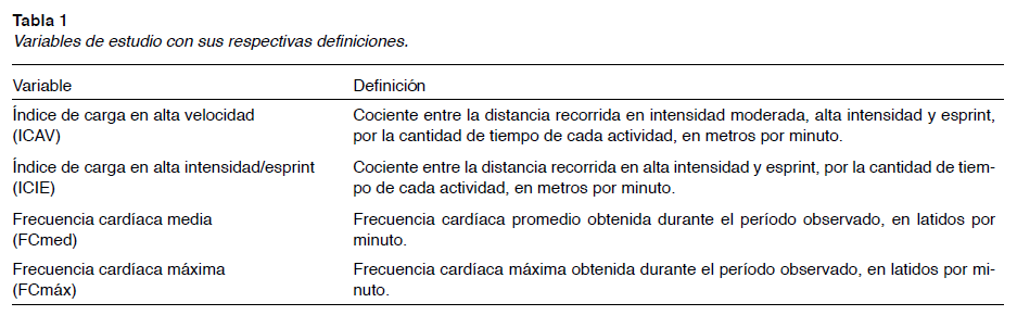 Fueron monitorizados los siguientes parámetros: distancia recorrida en intensidad moderada, en metros (de 14,9-19,8 km/h); distancia recorrida en alta intensidad, en metros (de 19,9-25,2 km/h); distancia recorrida en esprint, en metros (por encima de los 25,2 km/h); frecuencia cardíaca media (FCmed; lat.min), y frecuencia cardíaca máxima (FCmáx; lat.min). Para la clasificación de velocidades se tuvo en cuenta la empleada por Di Salvo et al. (Di Salvo et al., 2009; Di Salvo et al., 2013), y a partir de estos parámetros se obtuvieron las cuatro variables de estudio (tabla 1).