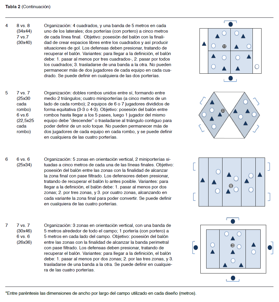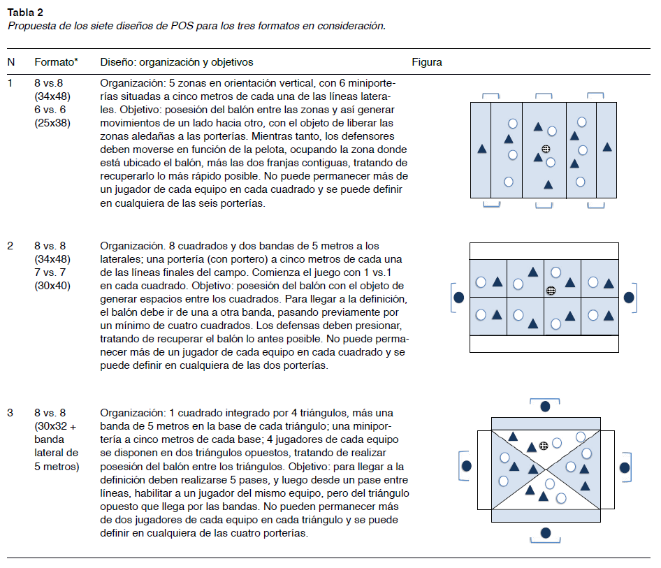Juegos de posesión: diseño. Para el diseño de los POS fueron considerados tres principios básicos del juego: a) la posesión del balón mediante movimientos individuales hacia movimientos colectivos (movimientos profundos, movimientos en diagonal, etc.); b) el pase, en función del espacio libre y de los diferentes movimientos (pase lateral buscando amplitud, pase vertical buscando progresar, pase profundo entre líneas, etc.), y finalmente, c) la recuperación del balón, que tiene por objeto ir al encuentro del jugador oponente que está en posesión del mismo, con el fin de interceptar e impedir de este modo que progrese en el ataque. Sobre la base de estos principios se seleccionaron tres formatos de POS: 6 vs. 6, 7 vs. 7 y 8 vs. 8. A modo de propuesta, las autorías de este estudio diseñaron diferentes esquemas específicos de POS, cada uno de ellos con objetivos bien delimitados para el sistema ofensivo y defensivo (tabla 2). Con el fin de establecer un común denominador, se estableció y testó un mismo diseño combinado entre los diferentes formatos. Así se obtuvieron finalmente cuatro diseños para cada formato de POS, con estructura y objetivos bien definidos (tabla 2).