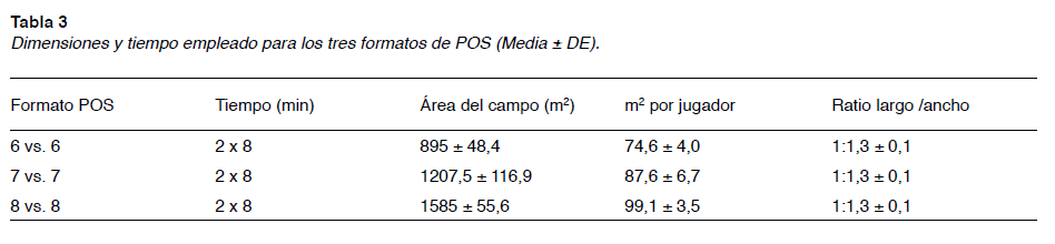 Las dimensiones de cada diseño fueron seleccionadas en función de las observaciones descritas en el artículo de Fradua et al. (2013): el área de campo de juego relativa (m. por jugador) delimitada entre 65-110 m., y la relación entre las distancias del largo- ancho del campo de 1:1 a 1:1,3. Las medidas promedio de cada formato se pueden observar en la tabla 3. Para cada diseño de POS, se realizó el mismo procedimiento de monitoreo que en los partidos. El mismo se desarrolló en dos tandas, en series de 8 minutos de duración (2 minutos de recuperación entre series), y se evaluó cada diseño en días diferentes, dentro de la temporada de juego (total: 8 observaciones para cada formato).