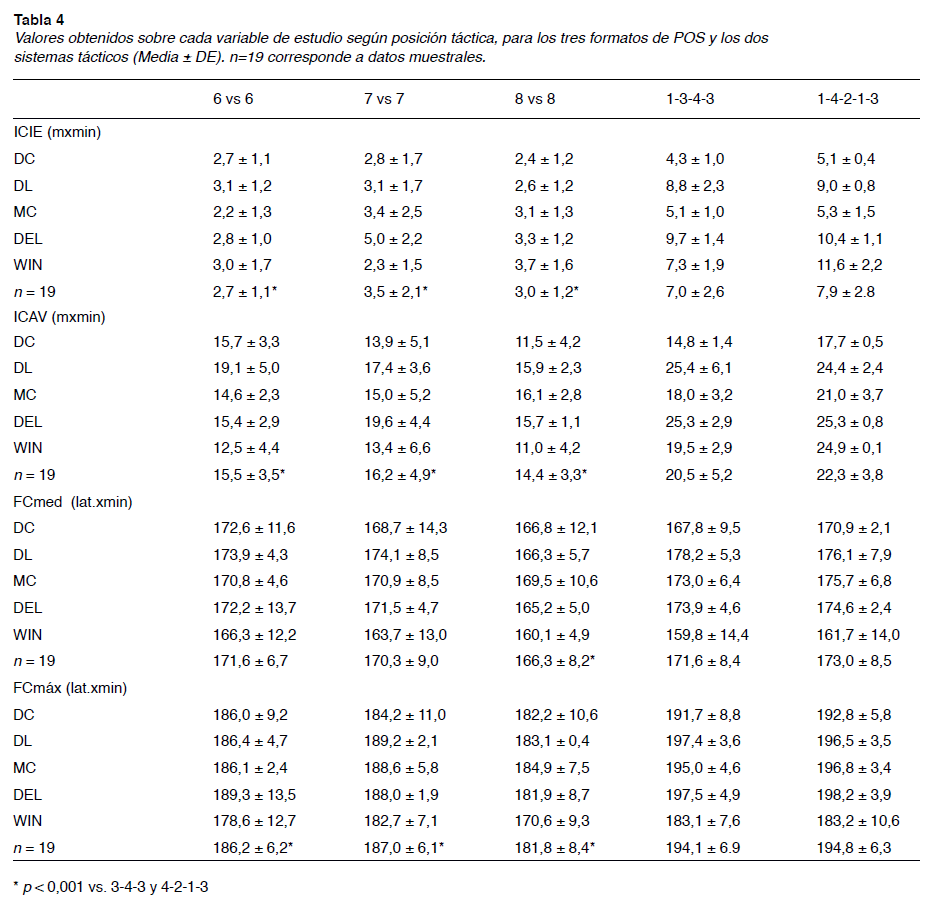 En lo que respecta a la respuesta cardíaca al esfuerzo, los valores promedio de FCmed en POS se asemejan a los del partido (con excepción al 8 vs. 8), sucediendo de la misma forma cuando se comparan dichos valores discriminados por la posición en el campo de juego. Investigaciones realizadas por Casamichana et al. (Casamichana, et al., 2013; Casamichana et al., 2015), donde se analizaron diferentes variables fisiológicas como la FCmed en tres formatos de JR (3 vs. 3, 5 vs. 5 y 7 vs. 7), se determinaron correlaciones significativas con medidas de carga externa como la distancia total recorrida, disminuyendo la fuerza de las relaciones cuando dicha variable fue asociada a acciones realizadas a alta velocidad (> 18 km/h) o esprints (> 21 km/h). Lacome et al. (2018) realizaron una comparación entre JR de dimensiones largas (40×55 metros, 18 jugadores, 118 m. por jugador) sobre dimensiones más pequeñas (25×30 metros, 13 jugadores, 61 m. por jugador): se determinó un porcentaje de la FCmáx del 79.3-80.6 %, mientras que en el presente estudio se observaron valores que van desde el 91,4 al 92,1 %. Dichas diferencias podrían ser explicadas desde la concepción de cada juego: al comparar rendimientos entre POS y JR, se debería tener en cuenta que la interacción continua de fundamentos que guardan relación con los principios básicos del POS difieren ampliamente en los JR, donde las consignas están supeditadas a jugar a uno, dos o tres toques, y convertir lo más rápido posible. De hecho, durante los POS existe una necesidad imperante de generar movimientos, de lo individual a lo colectivo, con el objetivo de crear espacios libres, y luego, ante la pérdida del balón, el deber de recuperarlo para generar una nueva posesión. Este fenómeno podría ser un factor importante a la hora de evaluar parámetros de rendimiento físico. Autorías como San Román-Quintana et al. (San Román-Quintana et al., 2013), encontraron que el número de toques permitidos por posesión individual en JR (7 vs. 7) afectó a las demandas físicas y fisiológicas, y al contrario que otras autorías, observaron una mayor respuesta cardíaca y mayores distancias recorridas en los formatos con juego libre de toques (mayor FCmed durante los JR de toque libre: 159,4 ± 10,7 l.min, con respecto a los JR jugando a dos toques: 146,9 ± 8,4 l.min). En contraposición a lo último expuesto, Gaudino et al. (2014) llegaron a la conclusión que todos los parámetros relacionados a la alta intensidad han sido más altos durante los JR en comparación con los POS. Pero en dicho estudio no se hace una descripción específica del diseño de los POS, excepto a algunas diferencias con relación a los JR: no jugaban porteros, la superficie por jugador era mayor compensando la no participación de los porteros, y la única consigna descrita fue la mayor posesión posible del balón versus la acción del oponente.
