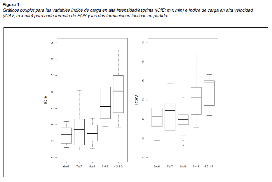 Al comparar los valores obtenidos en las medias entre los formatos POS y los dos sistemas tácticos, tanto el ICIE como el ICAV son significativamente más bajos a las medias obtenidas en los partidos (. < ,001). En el caso de ICIE dichos valores representan entre un 38,6 a 50 % sobre la formación 1-3-4-3, y entre un 37,5 a 48,6 % sobre la formación 1-4-2-1-3 (figura 1). Para ICAV, los valores representan un porcentaje más alto: 70 a 75,2 % para el 3-4-3, y 69,2 a 72,3 % para el 4-2-1-3 (figura 1).