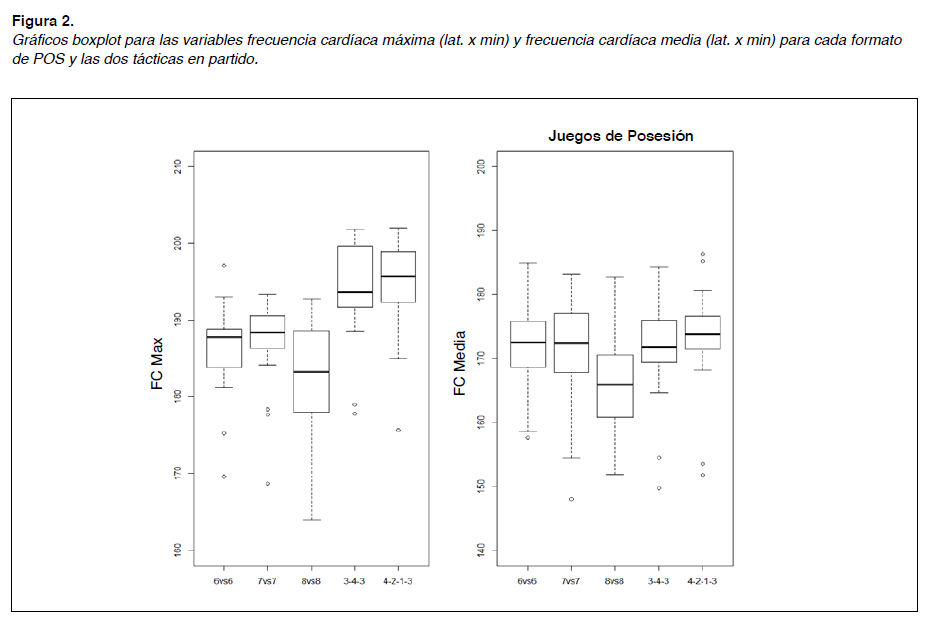 Con respecto al comportamiento cardiovascular al esfuerzo, la FCmed valorada en POS no es diferente a la de partido, con excepción al 8 vs. 8, donde se observaron entre 5 y 7 lat. x min menos en ambas formaciones tácticas (3,1 a 3,9 % menor) (figura 2). Sin embargo, para la FCmáx las medias muestrales de POS son significativamente más bajas a la de partido (4 a 7 % más bajo, 7 a 13 lat. x min menos) (. < ,001) (figura 2).