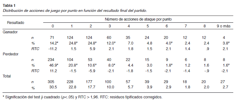 Los resultados de las comparaciones por número de acciones por punto (Tabla 1) mostraron diferencias entre ganadores y perdedores del partido (X.(6) = 54.920, . < .001). Los ganadores realizaron una o más acciones de ataque en el 85 % de los puntos, siendo 50 % entre una y dos acciones. Por el contrario, los perdedores no lograron realizar ninguna acción de ataque en el 47 % de los puntos. La mayor diferencia se observó en los puntos con 2 acciones, con un 14 % más de casos en los ganadores en comparación con los perdedores.