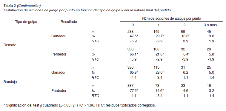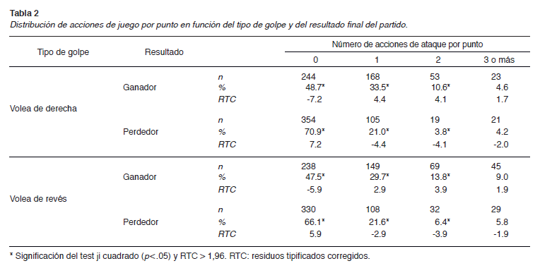 La división por tipos de golpe (Tabla 2) mostró diferencias en la distribución de acciones por punto entre ganadores y perdedores en todos los golpes: volea de derecha (X.(3) = 54.772; . < .001), volea de revés (X.(3) = 38.452; . < .001), remate (X.(6) = 17.071; . < .001) y bandeja (X.(3) = 63.161; . < .001). Según los resultados obtenidos, podemos observar diferencias en los porcentajes de cada tipo de golpe. Por un lado, se muestra que el equipo ganador del punto realiza más acciones de ataque por punto que el equipo perdedor. Por otro lado, se ha obtenido en todas las acciones de ataque un porcentaje mayor por parte del equipo ganador en cada tipo de golpe. De este modo, la volea de derecha ha sido el golpe más utilizado en puntos dónde solo hay una acción de ataque, la volea de revés mostró ser el golpe más utilizado en puntos dónde hay dos o más acciones de ataque. En cuanto al remate, se observó mayor uso por parte del equipo ganador en una o más acciones de ataque.