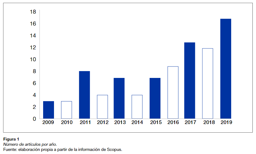 En cuanto al área de conocimiento desde la que se aborda este tema, destacan el peso de las Ciencias Sociales (34.2 %) y ciencias de la salud (29 %) frente a otras áreas como la medicina (18.7 %), la psicología (10.9 %) o las artes (2.6 %). Respecto a la productividad científica basándose en los datos del número de artículos publicados por año, destacan especialmente los resultados obtenidos en la última década (Figura 1). Este análisis permite conocer la frecuencia de publicación sobre esta cuestión, la evolución del interés por este objeto de estudio y la tendencia general diacrónica. De los 103 documentos publicados desde 1993 hasta el 2019, el número de publicaciones ha ido creciendo en los últimos tiempos, especialmente a partir de 2009, con un 84 % de la producción analizada.